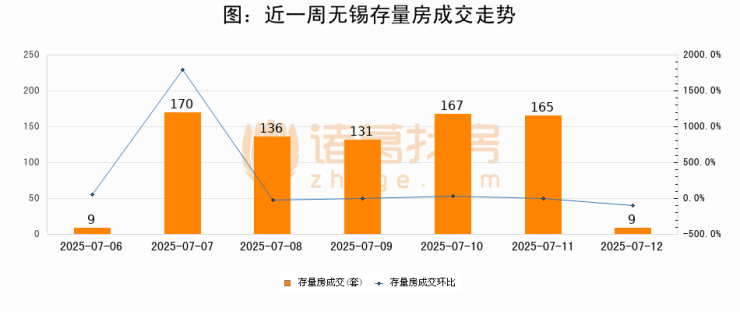 从存量房来看,2025年07月12日无锡存量房单日成交9套,比昨日减少156套,环比下降94.5%。从近一周存量房成交来看,无锡存量房日均成交套数为112套,07月12日单日成交9套,低于近一周平均水平92%。