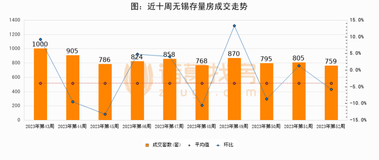 存量房方面,第52周无锡存量房成交759套,较上周减少46套,环比下降5.7%。从近十周成交走势来看,周均成交套数为837套,本周低于平均水平9.3%。