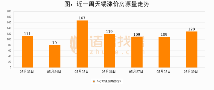 根据诸葛找房数据显示,无锡24小时涨价房源量为128套,较05月28日增加19套,环比上涨17.4%。与此同时,涨价房源占比小幅扩大,业主信心有所提升。