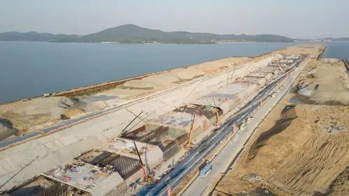 从隧道内部出来驶入临时便道,站在临时大堤远远望去,太湖隧道已经部分“埋入”湖底,两个标段先后完成了多次隧道回水作业,“下潜”入湖达3.08公里,预计南泉段下一次回水,将是土建完工时最后一次回水。