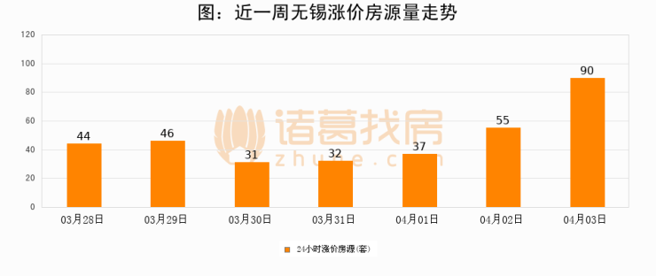 根据诸葛找房数据显示,无锡24小时涨价房源量为90套,较04月02日增加35套,环比上涨63.6%。与此同时,涨价房源占比小幅扩大,业主信心有所提升。