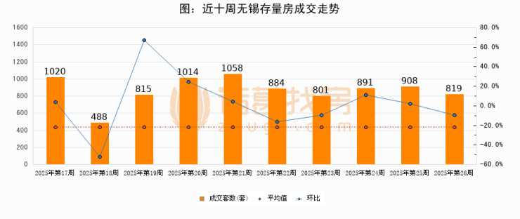 存量房方面,第26周无锡存量房成交819套,较上周减少89套,环比下降9.8%。从近十周成交走势来看,周均成交套数为869套,本周低于平均水平5.8%。