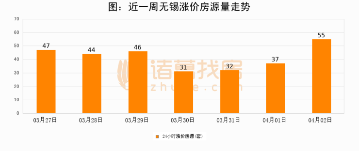 根据诸葛找房数据显示,无锡24小时涨价房源量为55套,较04月01日增加18套,环比上涨48.6%。与此同时,涨价房源占比小幅扩大,业主信心有所提升。