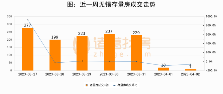 从存量房来看,2023年04月02日无锡存量房单日成交7套,比昨日减少11套,环比下降61.1%。从近一周存量房成交来看,无锡存量房日均成交套数为170套,04月02日单日成交7套,低于近一周平均水平95.9%。