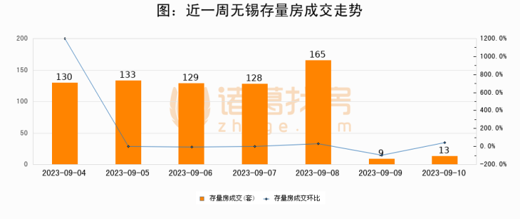 从存量房来看,2023年09月10日无锡存量房单日成交13套,比昨日增加4套,环比上涨44.4%。从近一周存量房成交来看,无锡存量房日均成交套数为101套,09月10日单日成交13套,低于近一周平均水平87.1%。