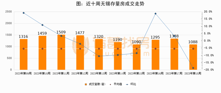 存量房方面,第18周无锡存量房成交1088套,较上周减少250套,环比下降18.7%。从近十周成交走势来看,周均成交套数为1308套,本周低于平均水平16.8%。