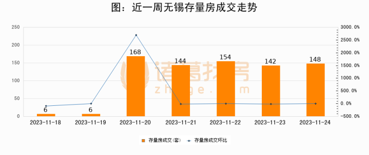从存量房来看,2023年11月24日无锡存量房单日成交148套,比昨日增加6套,环比上涨4.2%。从近一周存量房成交来看,无锡存量房日均成交套数为109套,11月24日单日成交148套,高于近一周平均水平35.8%。