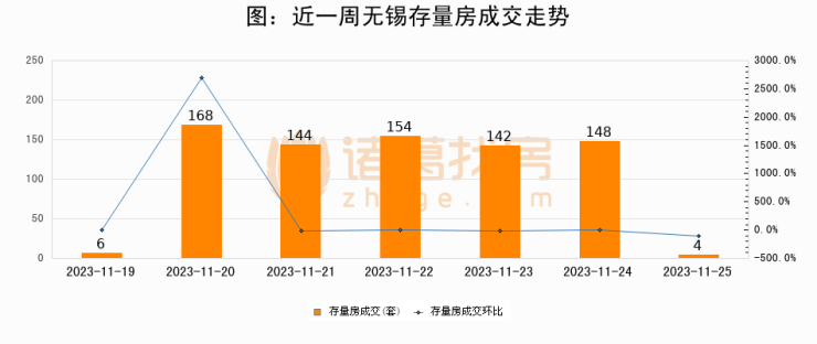 从存量房来看,2023年11月25日无锡存量房单日成交4套,比昨日减少144套,环比下降97.3%。从近一周存量房成交来看,无锡存量房日均成交套数为109套,11月25日单日成交4套,低于近一周平均水平96.3%。