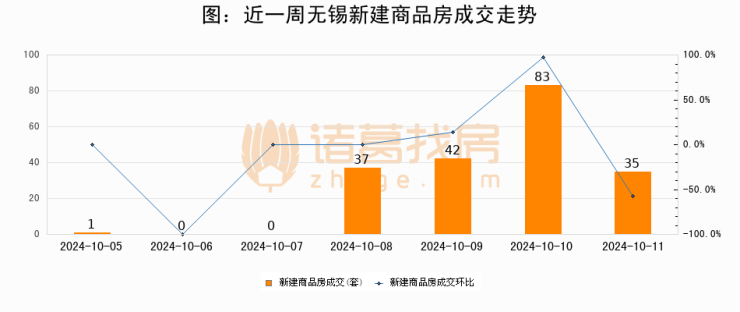 根据无锡市房地产市场管理和监测中心数据显示,2024年10月11日无锡新建商品房成交35套,较昨日减少48套,环比下降57.8%