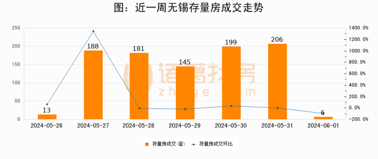 从存量房来看,2024年06月01日无锡存量房单日成交6套,比昨日减少200套,环比下降97.1%。从近一周存量房成交来看,无锡存量房日均成交套数为134套,06月01日单日成交6套,低于近一周平均水平95.5%。