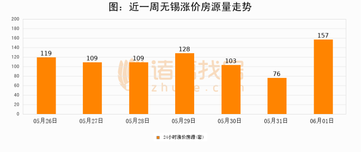 根据诸葛找房数据显示,无锡24小时涨价房源量为157套,较05月31日增加81套,环比上涨106.6%。与此同时,涨价房源占比小幅扩大,业主信心有所提升。