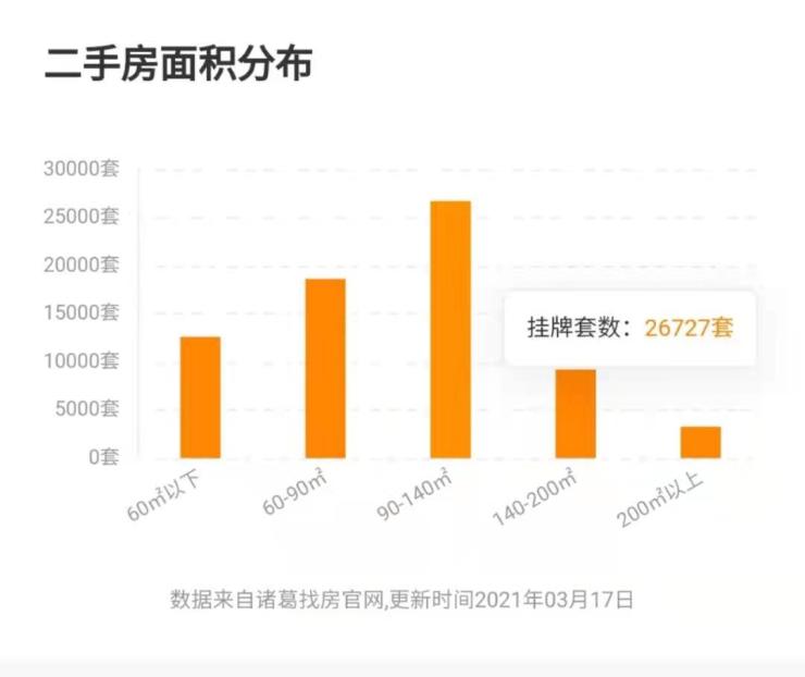 据诸葛找房数据显示,2021年3月16日无锡90-140平的房源数量最多,为26727套。