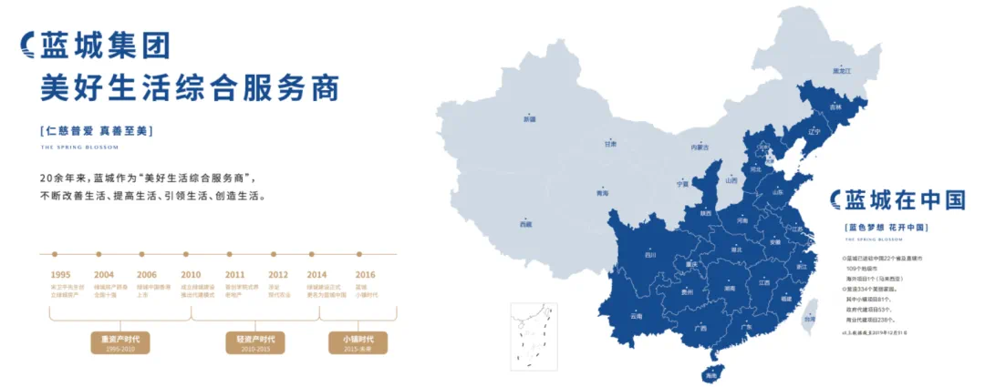 多年来,蓝城以“为合伙人、为家人、为城乡、为社会”的企业使命,一直深耕在代建、投资、颐养、农业、健康等多个板块,于此同时,我们依旧不忘,放眼城市未来,以远见思维,涉足于城乡发展、小镇计划等多个领域,进驻全国,成为了中国房地产轻资产运营引领企业。