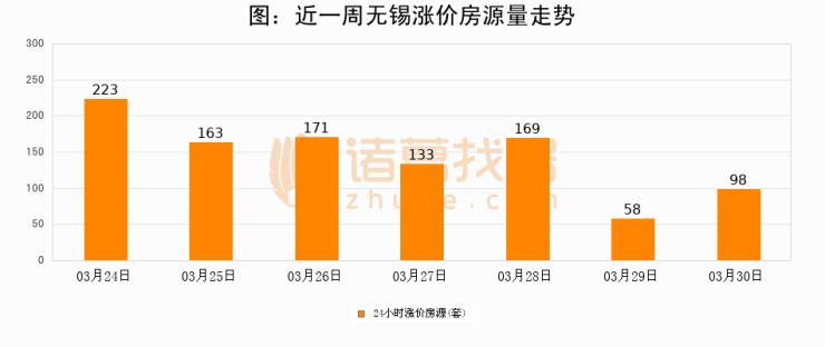 根据诸葛找房数据显示,无锡24小时涨价房源量为98套,较03月29日增加40套,环比上涨69%。与此同时,涨价房源占比小幅扩大,业主信心有所提升。