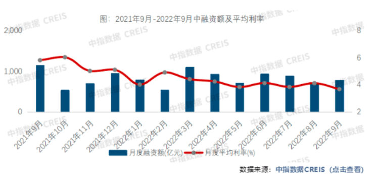 销售业绩有所回暖的同时,房企面临的资金压力也在有所缓解。数据显示,9月房企融资平均利率同比出现下降,信用债发行出现回暖迹象。据中指研究院监测,2022年9月房地产企业非银融资总额为777.9亿元,同比下降32.2%,环比上升13.3%,融资形势稍有好转。行业平均利率为3.67%,同比下降2.14个百分点,环比下降0.44个百分点。