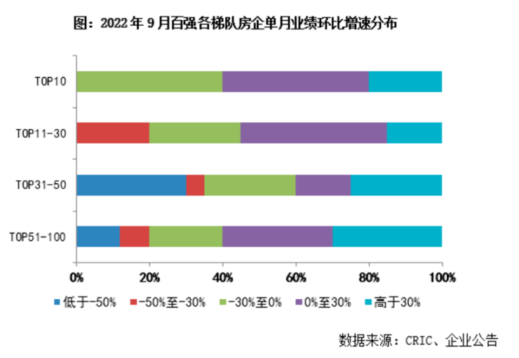 具体从企业表现来看,克而瑞报告显示,2022年9月超半数百强房企实现单月业绩环比增长,其中30家企业的环比增幅在0%到30%之间,25家企业环比增幅超过30%。如华润、招商、绿地、越秀、仁恒等企业的环比增幅均在35%以上。但从业绩同比来看,目前规模房企整体仍深陷负增长困局,9月单月业绩同比降低的企业数量达到近7成,仅3成企业实现了单月业绩同比增长。