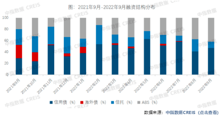 2022年1-9月,房地产企业非银融资总额7331.5亿元,同比下降52.6%。从融资结构来看,信用债占比50.2%,同比提升19.9个百分点;海外债占比仅为2.4%,同比下降14.0个百分点;信托占比16.0%,同比下降15.1个百分点;ABS占比31.4%,同比提升9.3个百分点。前三季度非银融资总额分别占比33.1%、35.1%、32.1%,各季度融资比例差异不大,并未出现明显的融资高峰期。