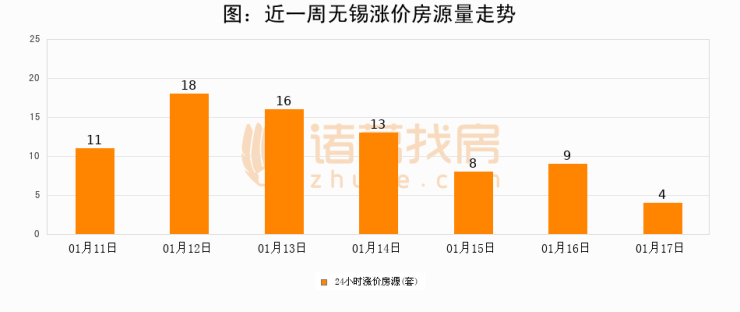 根据诸葛找房数据显示,无锡24小时涨价房源量为4套,较01月16日减少5套,环比下降55.6%。与此同时,涨价房源占比小幅回落,对于购房者来说是一个入市窗口期,购房者可抓住时机入市。