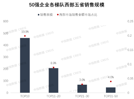 从西部重点五省市的市场销售额占比看,西部50强企业阵营分化差距拉大。TOP10企业在西部重点五省市的市场销售规模门槛为300亿,其销售金额在西部重点五省市的市场占比近20%;TOP11-20企业的销售规模集中在150-300亿之间,市场占比近9%;TOP21-30企业销售规模较为分散,40-140亿区间内均有分布,与TOP31-50的企业,分别贡献3%、4%的市场份额。
