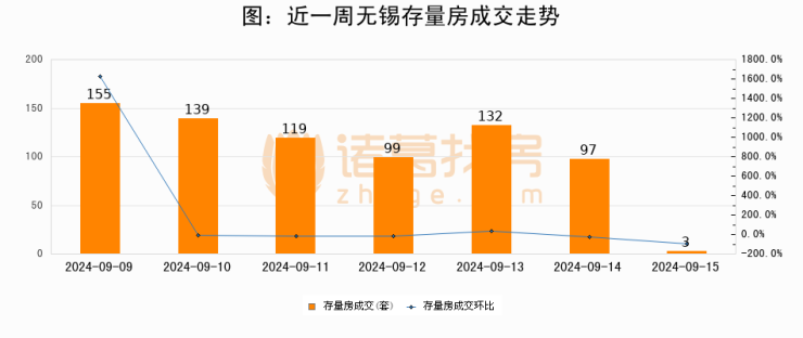 从存量房来看,2024年09月15日无锡存量房单日成交3套,比昨日减少94套,环比下降96.9%。从近一周存量房成交来看,无锡存量房日均成交套数为106套,09月15日单日成交3套,低于近一周平均水平97.2%。