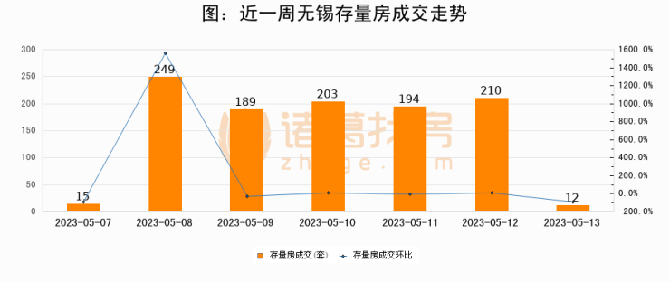 从存量房来看,2023年05月13日无锡存量房单日成交12套,比昨日减少198套,环比下降94.3%。从近一周存量房成交来看,无锡存量房日均成交套数为153套,05月13日单日成交12套,低于近一周平均水平92.2%。