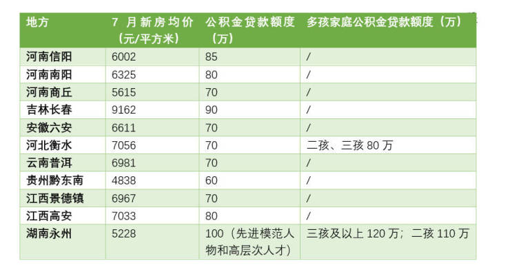 据不完全统计,在上调公积金贷款额度的城市中,以职工(含家庭)首次购买100平方米的首套住房为例,参照当地新房均价,至少包括河南信阳、河南南阳、河南商丘、湖南永州、吉林长春、安徽六安、河北衡水、云南普洱、贵州黔东南、江西景德镇、江西高安等地公积金贷款较高贷款额度可基本覆盖刚需购房金额。