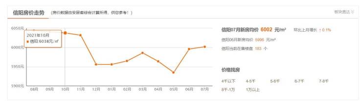 与河南信阳当地房价对比,安居客平台数据显示,7月信阳新房均价6002元/平方米,比上月增长0.1%,当前在售楼盘183个。按此粗略计算,以买100平方米首套住房为例,约合总价60.02万元。