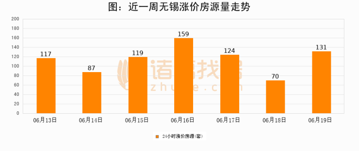 根据诸葛找房数据显示,无锡24小时涨价房源量为131套,较06月18日增加61套,环比上涨87.1%。与此同时,涨价房源占比小幅扩大,业主信心有所提升。