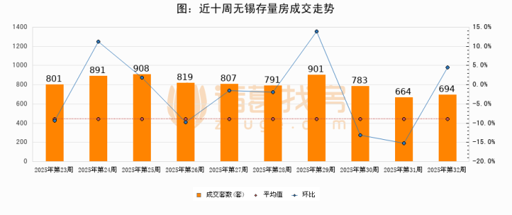 存量房方面,第32周无锡存量房成交694套,较上周增加30套,环比上涨4.5%。从近十周成交走势来看,周均成交套数为805套,本周低于平均水平13.8%。