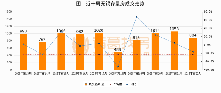 存量房方面,第22周无锡存量房成交884套,较上周减少174套,环比下降16.4%。从近十周成交走势来看,周均成交套数为902套,本周低于平均水平2%。