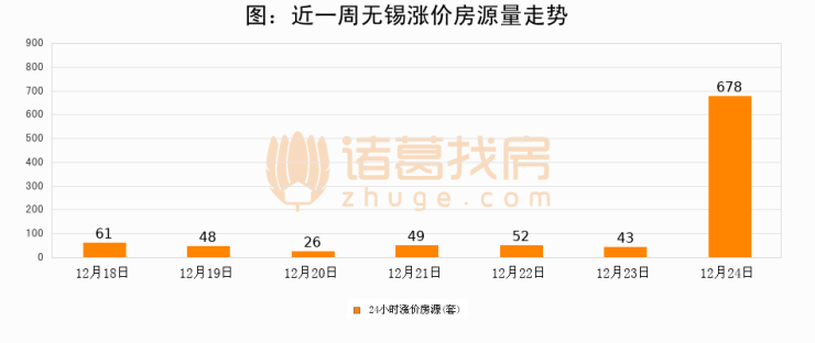 根据诸葛找房数据显示,无锡24小时涨价房源量为678套,较12月23日增加635套,环比上涨1476.7%。与此同时,涨价房源占比小幅扩大,业主信心有所提升。