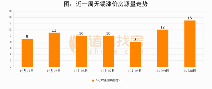 根据诸葛找房数据显示,无锡24小时涨价房源量为15套,较12月29日增加3套,环比上涨25%。与此同时,涨价房源占比小幅扩大,业主信心有所提升。