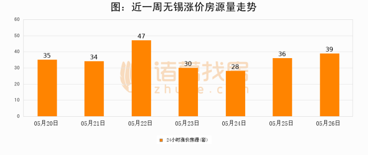 根据诸葛找房数据显示,无锡24小时涨价房源量为39套,较05月25日增加3套,环比上涨8.3%。与此同时,涨价房源占比小幅扩大,业主信心有所提升。