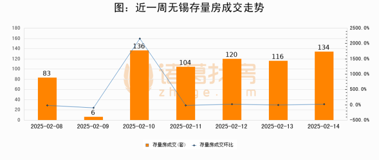 从存量房来看,2025年02月14日无锡存量房单日成交134套,比昨日增加18套,环比上涨15.5%。从近一周存量房成交来看,无锡存量房日均成交套数为99套,02月14日单日成交134套,高于近一周平均水平35.4%。