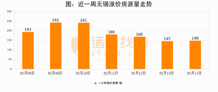 根据诸葛找房数据显示,无锡24小时涨价房源量为148套,较02月13日增加3套,环比上涨2.1%。与此同时,涨价房源占比小幅扩大,业主信心有所提升。