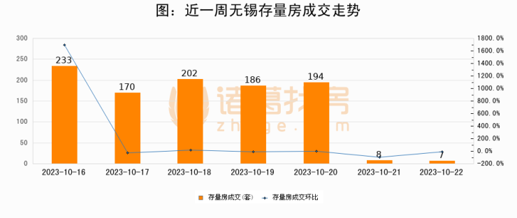 从存量房来看,2023年10月22日无锡存量房单日成交7套,比昨日减少1套,环比下降12.5%。从近一周存量房成交来看,无锡存量房日均成交套数为142套,10月22日单日成交7套,低于近一周平均水平95.1%。
