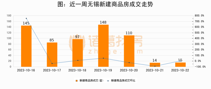 根据无锡市房地产市场管理和监测中心数据显示,2023年10月22日无锡新建商品房成交15套,较昨日增加1套,环比上涨7.1%