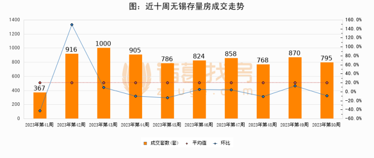 存量房方面,第50周无锡存量房成交795套,较上周减少75套,环比下降8.6%。从近十周成交走势来看,周均成交套数为808套,本周低于平均水平1.6%。