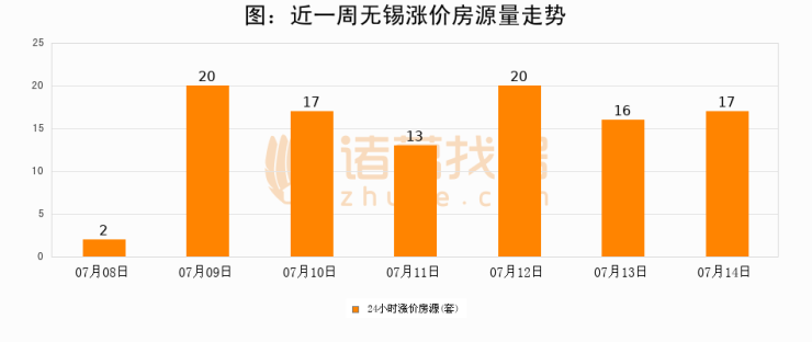 根据诸葛找房数据显示,无锡24小时涨价房源量为17套,较07月13日增加1套,环比上涨6.2%。与此同时,涨价房源占比小幅扩大,业主信心有所提升。