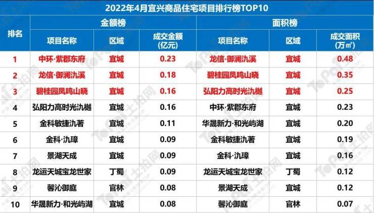 宜城在成交排行榜中独占鳌头,共有8个项目上榜。中环·紫郡东府以0.23亿元夺得金额榜排名前列,龙信·御澜氿溪以0.48万㎡摘得面积榜冠军 。