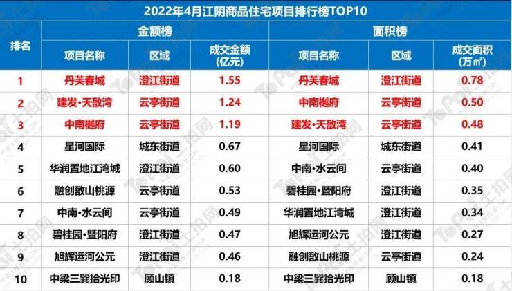 江阴主城区项目为排行榜主力,澄江街道和云亭街道各占据4席。新入市楼盘丹芙春城以1.55亿元、0.78万㎡夺得江阴金额榜、面积榜”双冠军“。