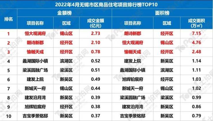 TOP10排行榜中,以改善楼盘为主,朗诗新郡、恒大观澜府、愉樾天成三个项目位列成交金额排行榜前三甲。从区域来看,经开区和新吴区均有3个项目上榜,锡山区占2席。