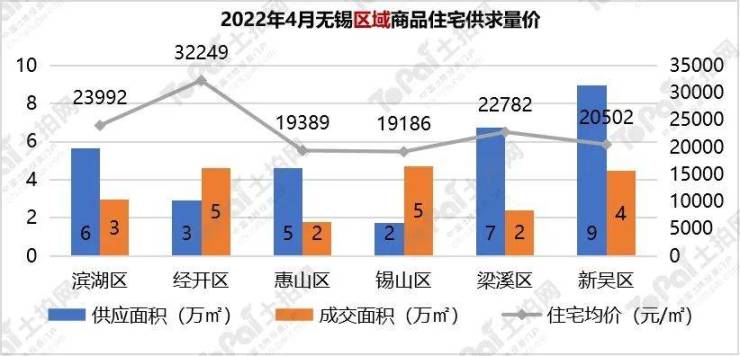 4月,无锡市区受疫情封控影响,住宅供求市场产生波动;供应量31万㎡,环比上涨6%;成交量为21万㎡,环比下降30%;成交均价为23462元/㎡,小幅下跌。新吴、梁溪、滨湖三区为市区供应主力;经开区以32249元/㎡均价持续领跑全市,滨湖区、梁溪区位列均价二、三位。