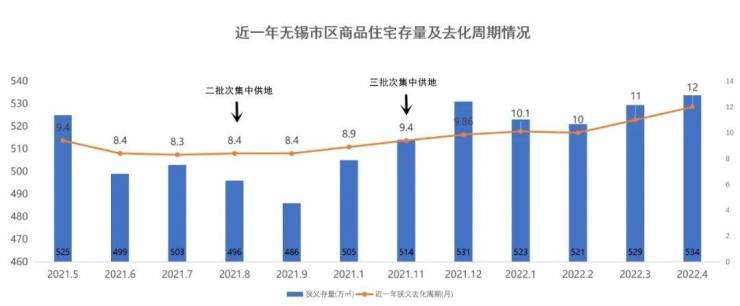 2022年4月底,无锡市区狭义库存533.8万㎡,去化周期相较前3个月略有拉长,已达12个月。截至2022年4月底,近一年商品住宅月均流速:44.5万㎡/月。
