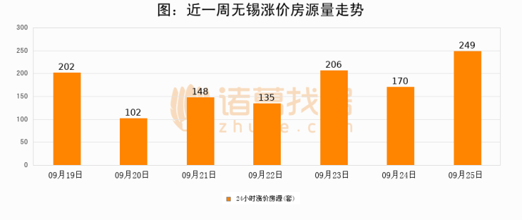 根据诸葛找房数据显示,无锡24小时涨价房源量为249套,较09月24日增加79套,环比上涨46.5%。与此同时,涨价房源占比小幅扩大,业主信心有所提升。