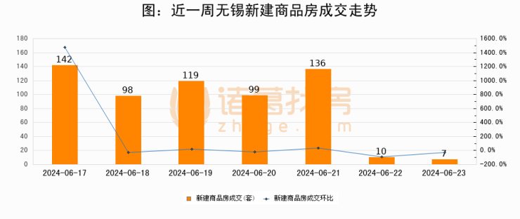 根据无锡市房地产市场管理和监测中心数据显示,2024年06月23日无锡新建商品房成交7套,较昨日减少3套,环比下降30%