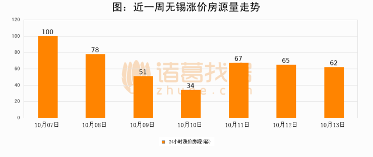 根据诸葛找房数据显示,无锡24小时涨价房源量为62套,较10月12日减少3套,环比下降4.6%。与此同时,涨价房源占比小幅回落,对于购房者来说是一个入市窗口期,购房者可抓住时机入市。