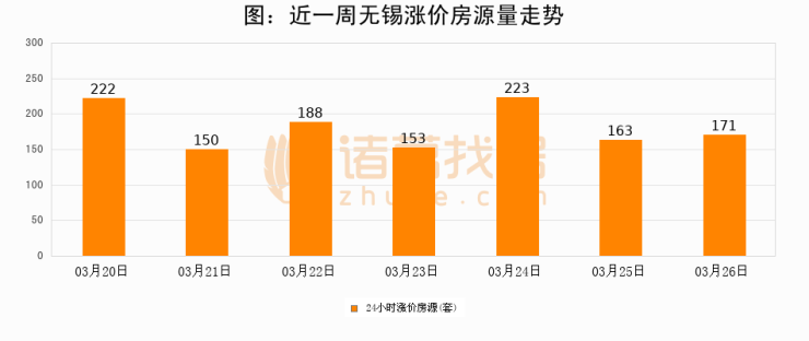 根据诸葛找房数据显示,无锡24小时涨价房源量为171套,较03月25日增加8套,环比上涨4.9%。与此同时,涨价房源占比小幅扩大,业主信心有所提升。