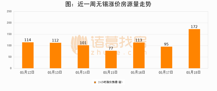 根据诸葛找房数据显示,无锡24小时涨价房源量为172套,较05月17日增加77套,环比上涨81.1%。与此同时,涨价房源占比小幅扩大,业主信心有所提升。