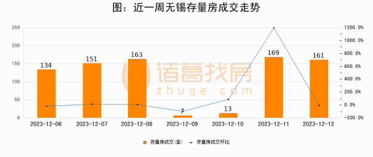 从存量房来看,2023年12月12日无锡存量房单日成交161套,比昨日减少8套,环比下降4.7%。从近一周存量房成交来看,无锡存量房日均成交套数为114套,12月12日单日成交161套,高于近一周平均水平41.2%。
